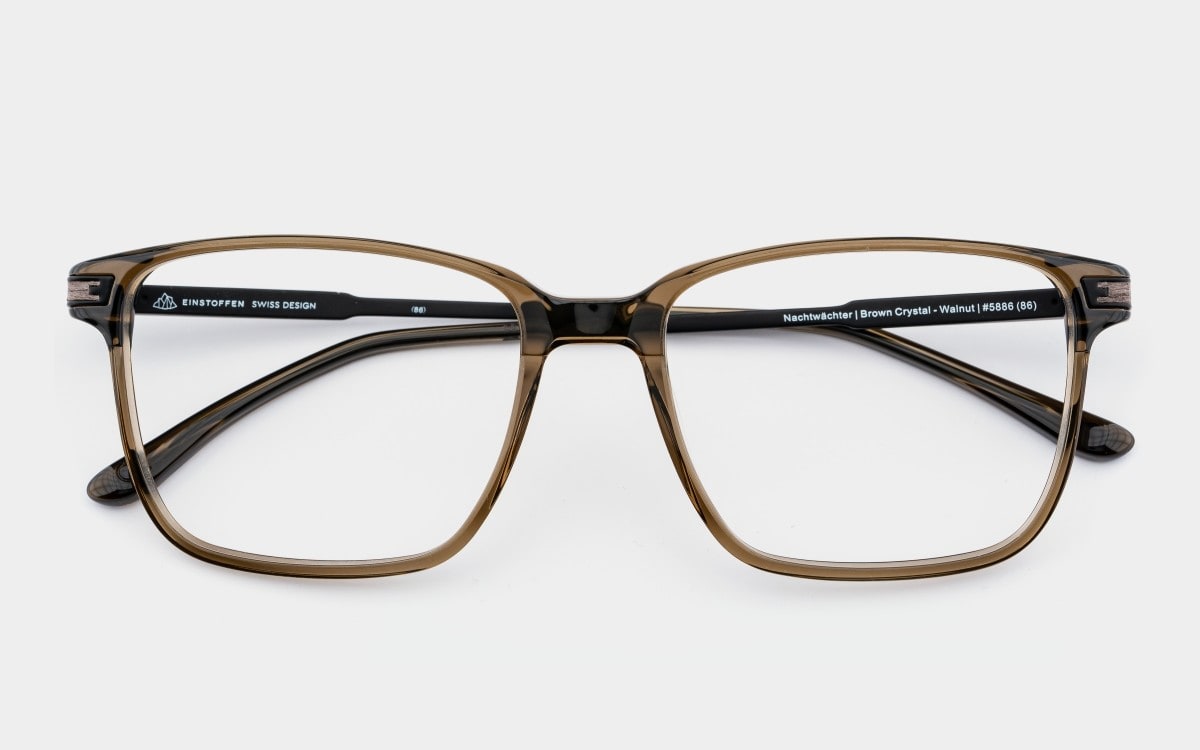 Gafa de graduado de acetato color marrón transparente y varillas de metal con detalles de madera.