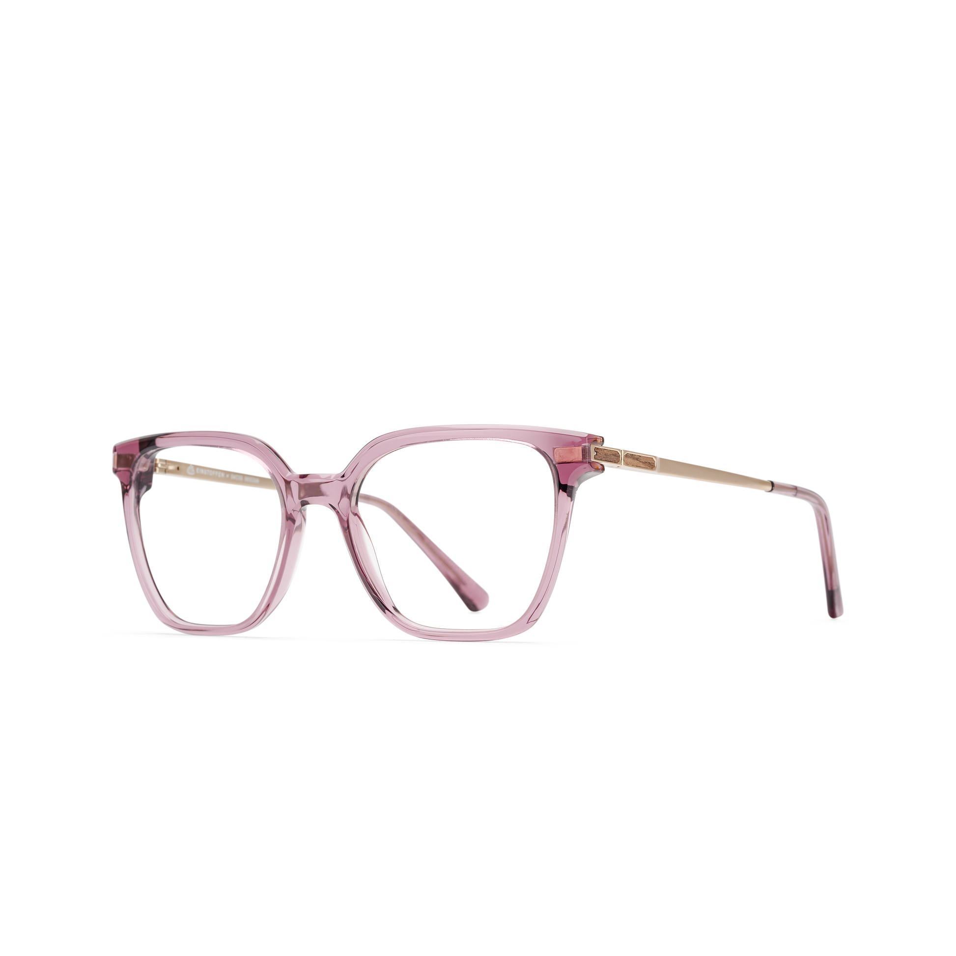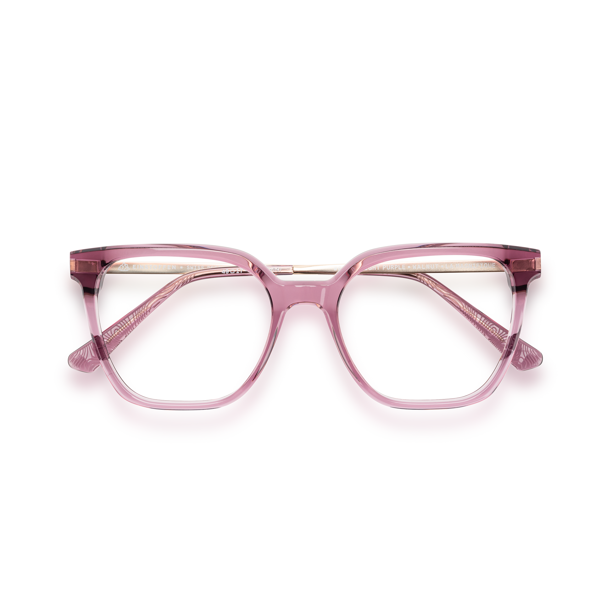 Gafa de graduado de acetato color púrpura claro y detalles de madera color nogal en las varillas doradas.