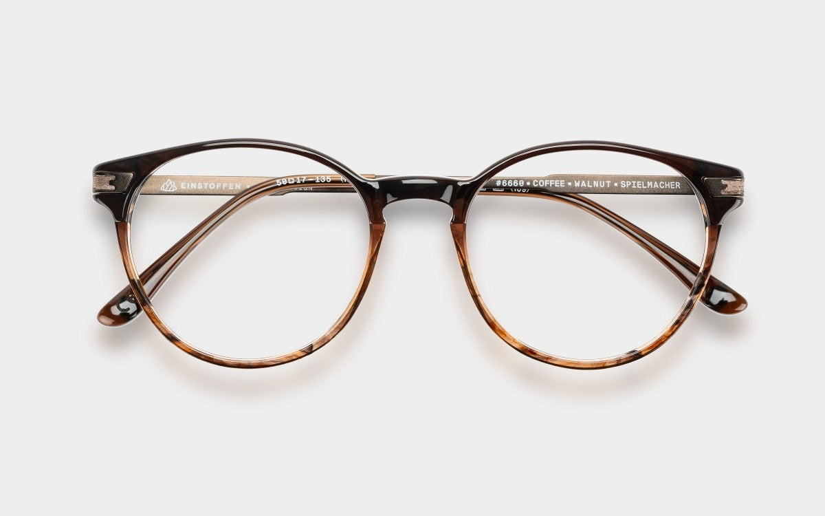 Gafa de graduado de acetato color café y detalles de madera color nogal en la varilla.