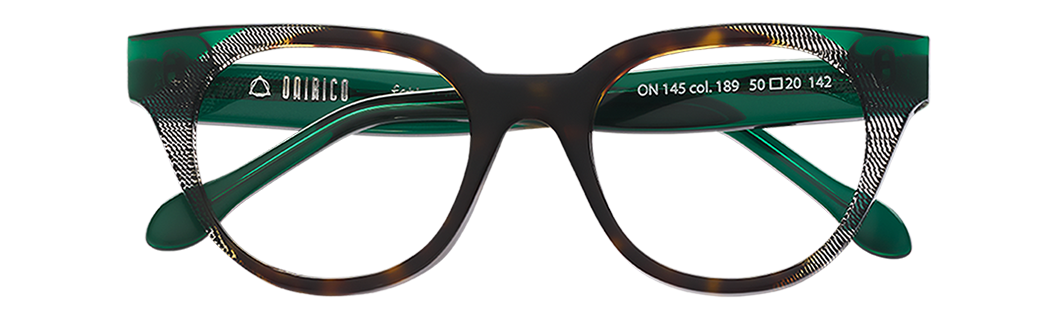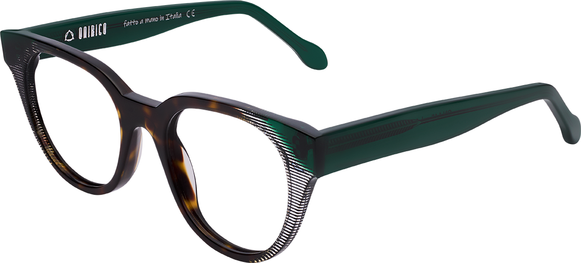 Gafa de graduado color carey con detalles transparentes y varillas verde botella.